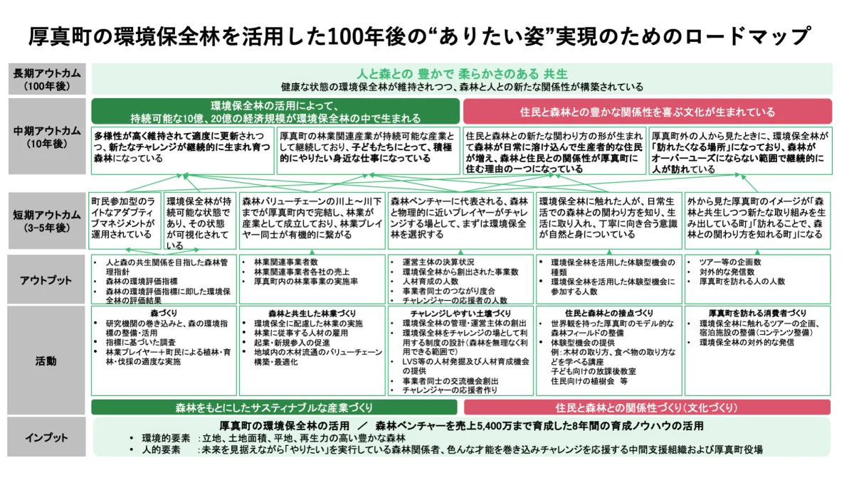 このロードマップの目的は、厚真町内の280ヘクタール(約60個分の東京ドーム)に及ぶ環境保全林を活用し、100年後に人と森との調和の取れた未来を実現することです。この目標を設定した上で、10年後や3~5年後に達成するべき具体的な目標を細分化し、それぞれに必要な活動を明確化しました。それにより、現時点での行動指針を緻密に設計し、関係者とのコミュニケーションを円滑に進めるための共通言語を提供しています。