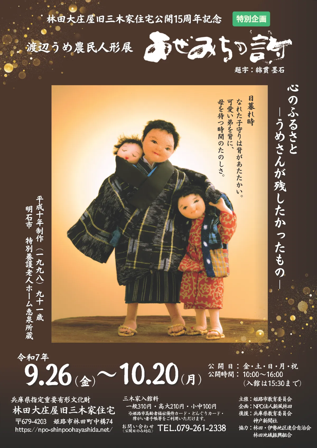兵庫県姫路市では、旧三木家住宅公開15周年を記念した特別企画が進行中です。今回のハイライトは、「渡辺うめ農民人形展 あぜみちの詩(うた)」です。この展示は、農村の暮らしや風景を人形を通して描写し、私たちの心に温かさを感じさせるものです。人形を通じて、かつての農村の風情を再現し、昔ながらの農作業や人々の生活を思い起こさせるこの展示は、多くの人に感動を与えることでしょう。