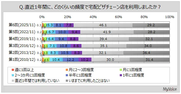 最近の調査によると、宅配ピザチェーン店の利用状況が明らかになりました。調査はマイボイスコム社が2025年11月1日から7日まで実施したもので、11,285名の回答を得ました。その結果、直近1年間に宅配ピザチェーン店を利用した人は約25%に達し、特にネットでの注文が優勢とされています。