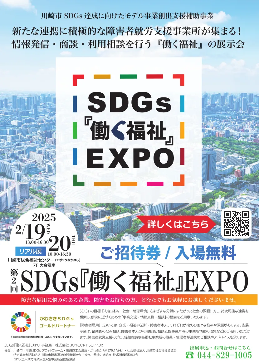2025年2月19日(水)と20日(木)、神奈川県川崎市の総合福祉センターエポックなかはらにて、第2回「SDGs『働く福祉』EXPO」が開催されます。本展示会は、障害者就労支援をテーマにしたもので、あらゆる関連団体や企業が一堂に会し、互いの情報や経験を交換する場です。