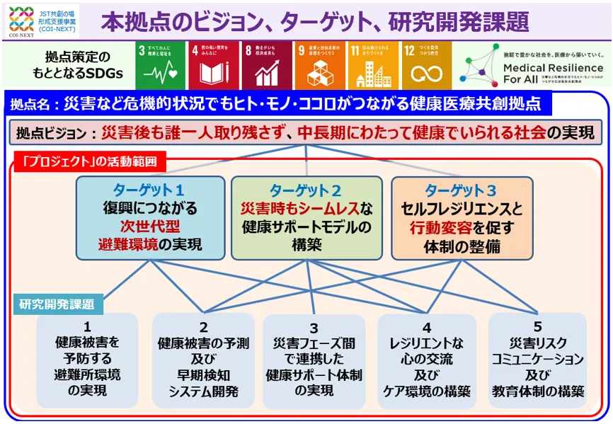 この共創拠点の最終的なビジョンは、「災害後も誰一人取り残さず、中長期にわたって健康でいられる社会の実現」です。具体的な施策としては、次世代型避難環境の実現や、健康被害の早期予測システムの開発が含まれます。これを通じて、災害時でも安心して生活できる地域社会の実現を目指しています。