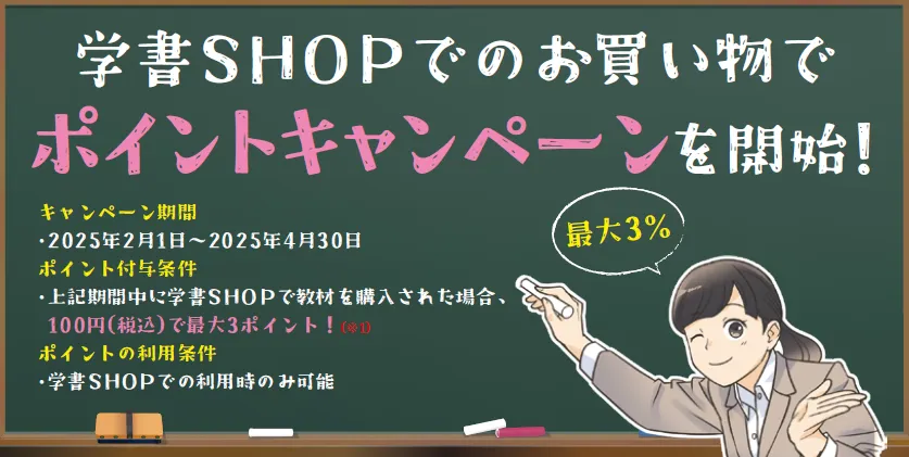 この新たなポイントキャンペーンは、学書SHOPを利用するすべての方々にとって、非常にお得な機会です。教材費が少しでも軽減でき、美しい学びの環境を提供する手助けになることでしょう。何か不明な点がありましたら、お気軽にお問い合わせください。