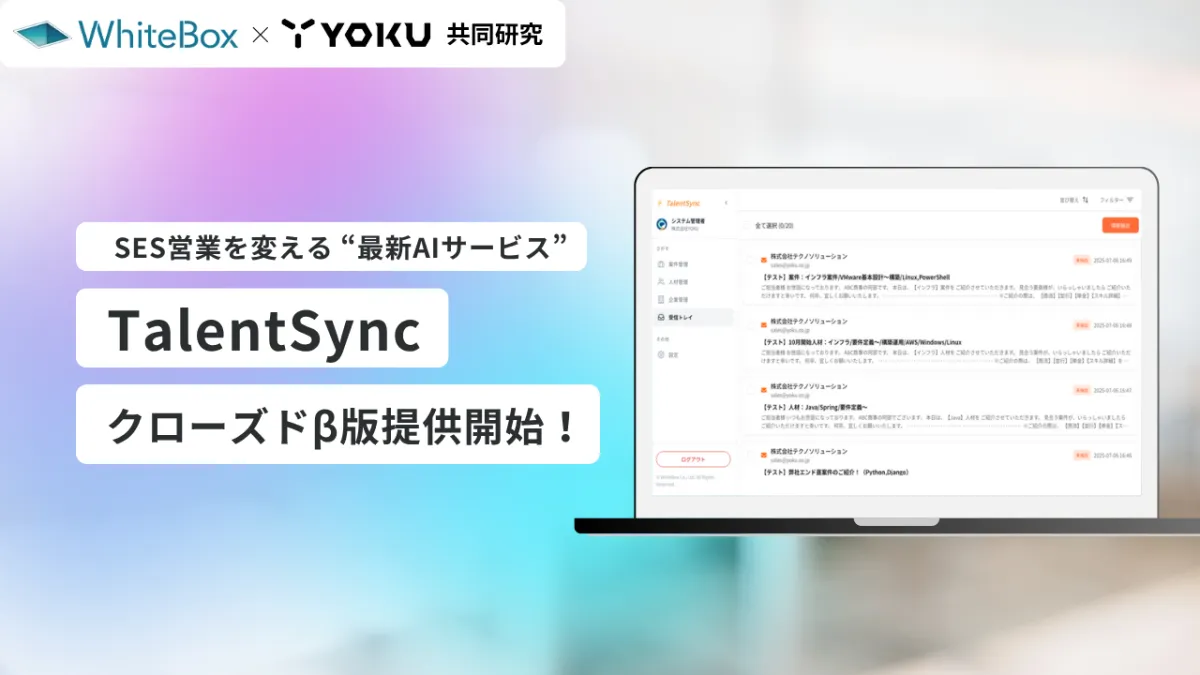 株式会社WhiteBoxは、生成AIを活用した新たな自動マッチングサービス「TalentSync」のクローズドβ版を2025年7月7日にリリースしました。このサービスは、SI(システムインテグレーション)やSES(システムエンジニアリングサービス)事業者を対象に、案件情報と人材情報を効果的にマッチングすることを目的としています。