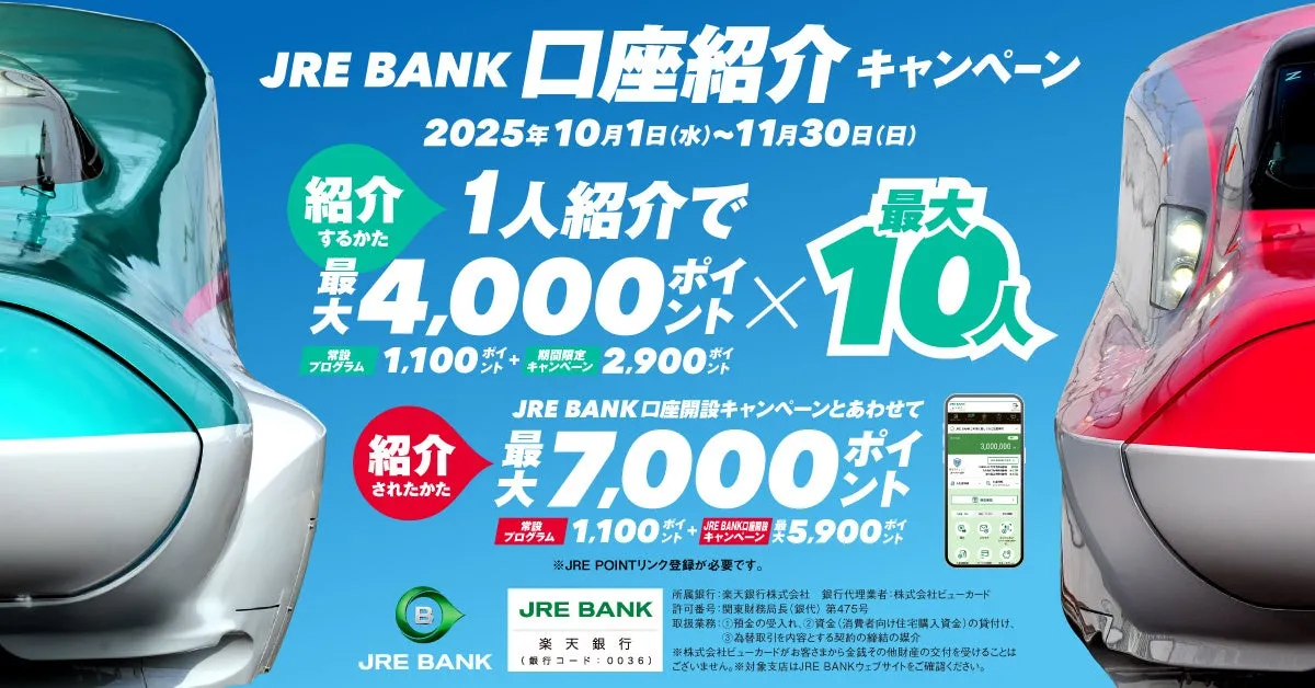 JR東日本は、2025年10月1日から「JRE BANK口座紹介キャンペーン」を実施します。このキャンペーンでは、口座を紹介した方に最大4000 JRE POINTが進呈されるチャンスがあります。紹介できる人数は最大10名までとなっていますので、お友達をどんどん紹介しましょう!