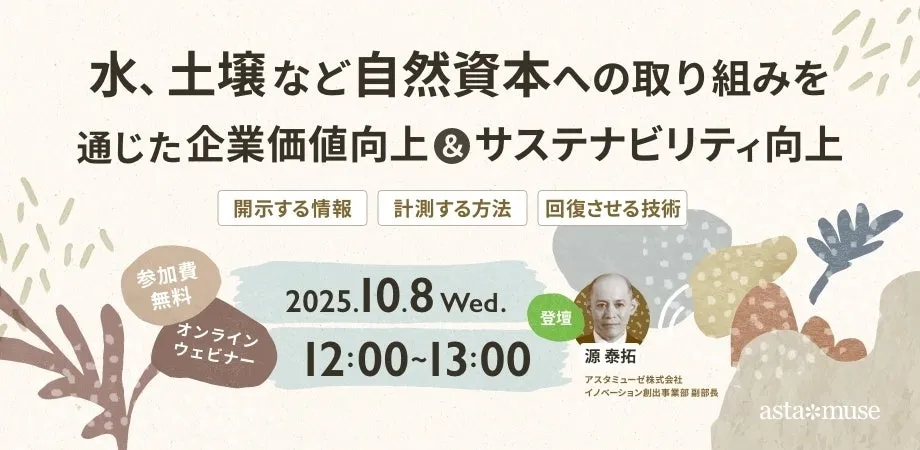 アスタミューゼ株式会社は、2025年10月8日(水)12:00から13:00まで、無料のウェビナー「水、土壌など自然資本への取り組みを通じた企業価値向上&サステナビリティ向上 ~開示する情報・計測する方法・回復させる技術~」を提供します。これは、サステナビリティへの関心を持つ企業関係者を対象とした内容となっており、企業価値向上を目指す方々に向けた貴重な情報が得られます。