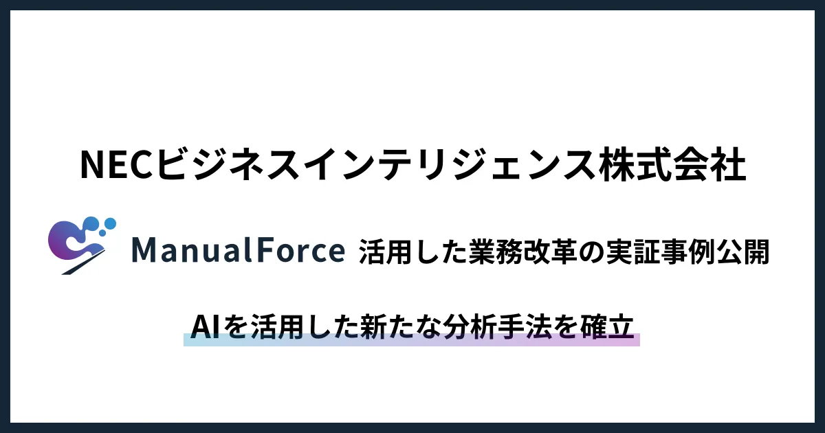 NECビジネスインテリジェンスの松島利充氏は次のように述べています。 「ManualForceのAI技術を活用することで、マニュアル作成だけでなく、タスクマイニングツールとしても有効な活用方法が見つかったこの成功は、ManualForceへの新たな価値の証明です。」