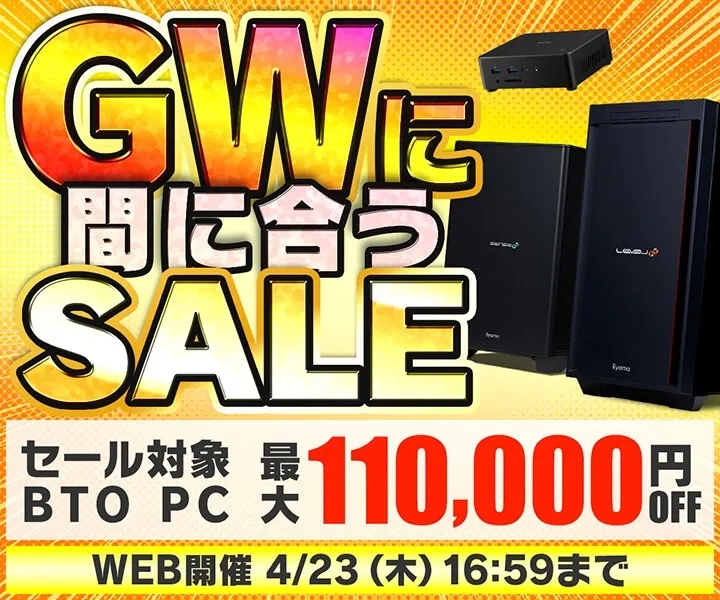 パソコン工房が特別に実施している「GWに間に合うセール」では、ゲーミングPCやクリエイターパソコンをお得に手に入れることができます。このセールは、2026年4月10日(金)から4月23日(木)16時59分までの限定期間で実施中です。