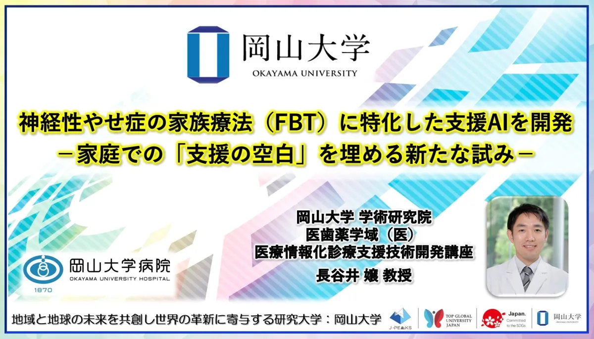 そのニーズに応えるため、岡山大学はFBTの専門知識を搭載したAIチャットボットを開発しました。このAIは患者の家族が直面する様々な困難に対処するため、24時間いつでも利用可能で、具体的なアドバイスや声かけの提案を行います。技術的に新しい試みとして、その価値は大いに期待されています。