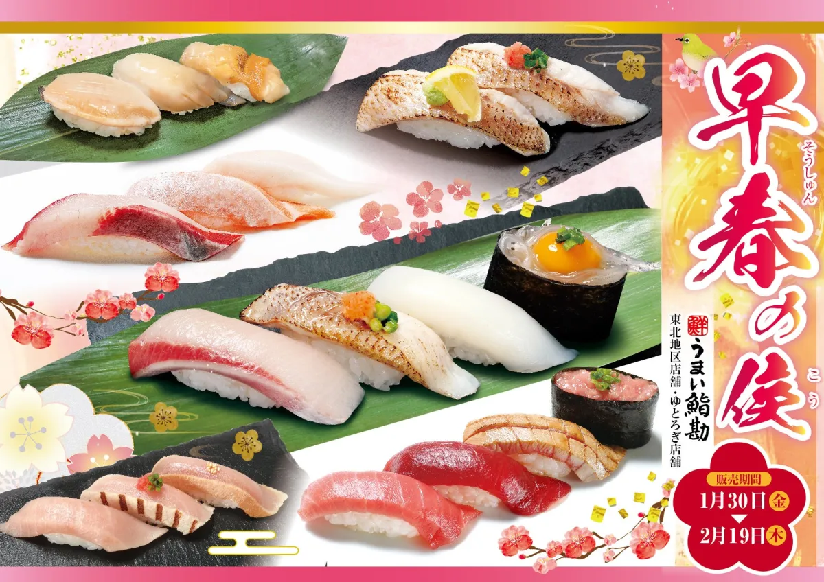 2026年1月30日から2月19日まで、株式会社アミノが運営する「うまい鮨勘」の東北地区・ゆとろぎ店舗で「早春の候」と題したフェアが行われます。
