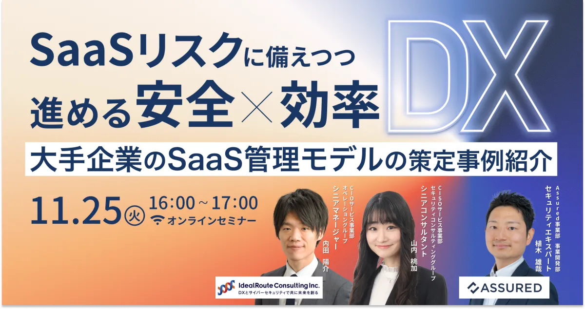 株式会社アシュアードが、アイディルートコンサルティング株式会社と共に「SaaSリスクに備えつつ進める安全×効率DX ~大手企業のSaaS管理モデルの策定事例紹介~」というオンラインセミナーを開催します。日程は2025年11月25日、時間は午後4時から5時までです。このセミナーでは、SaaSの導入が進む中での企業における様々なリスクに対処するための実践的なノウハウを提供します。