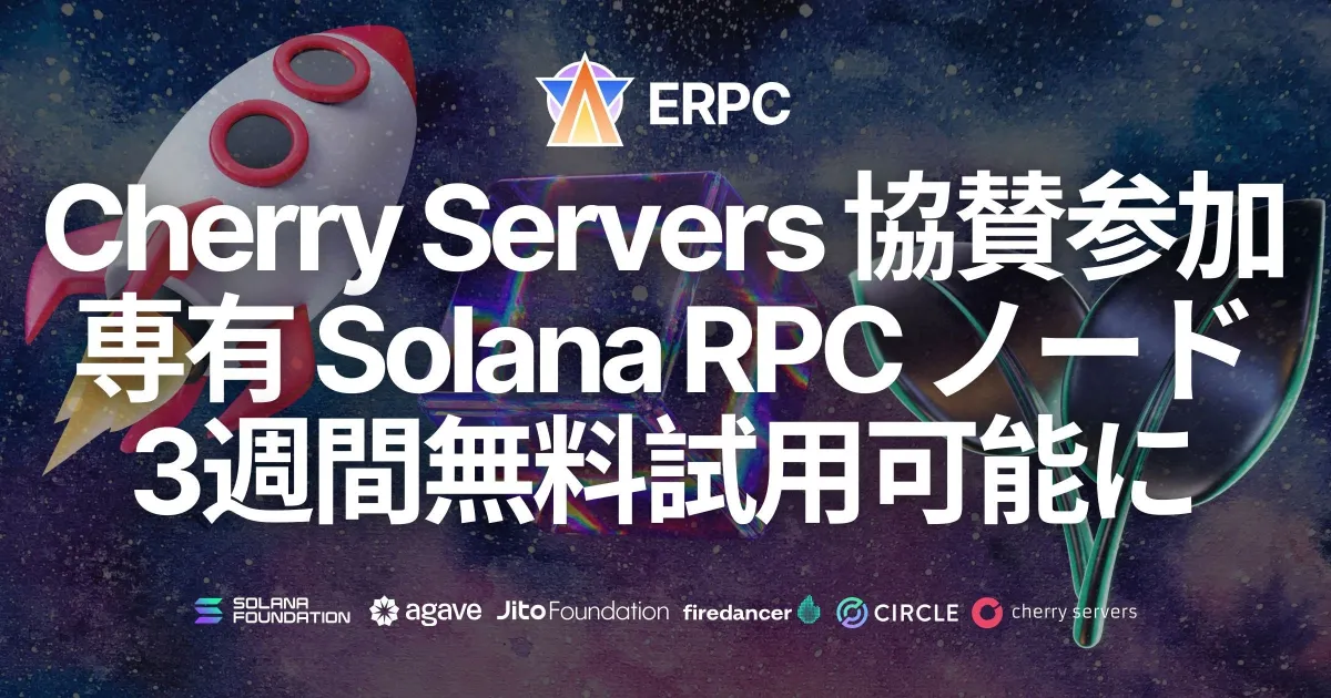ELSOUL LABO B.V.(オランダ・アムステルダム本社)は、Solana Enhanced RPC「ERPC」を提供する企業です。最近、同社がスタートした「ERPC Startup Program」の一環として、グローバルデータセンターパートナーであるCherry Serversが協賛参加されました。これにより、人気の専有Solana RPCノードをなんと3週間無料で試すことができるようになりました。