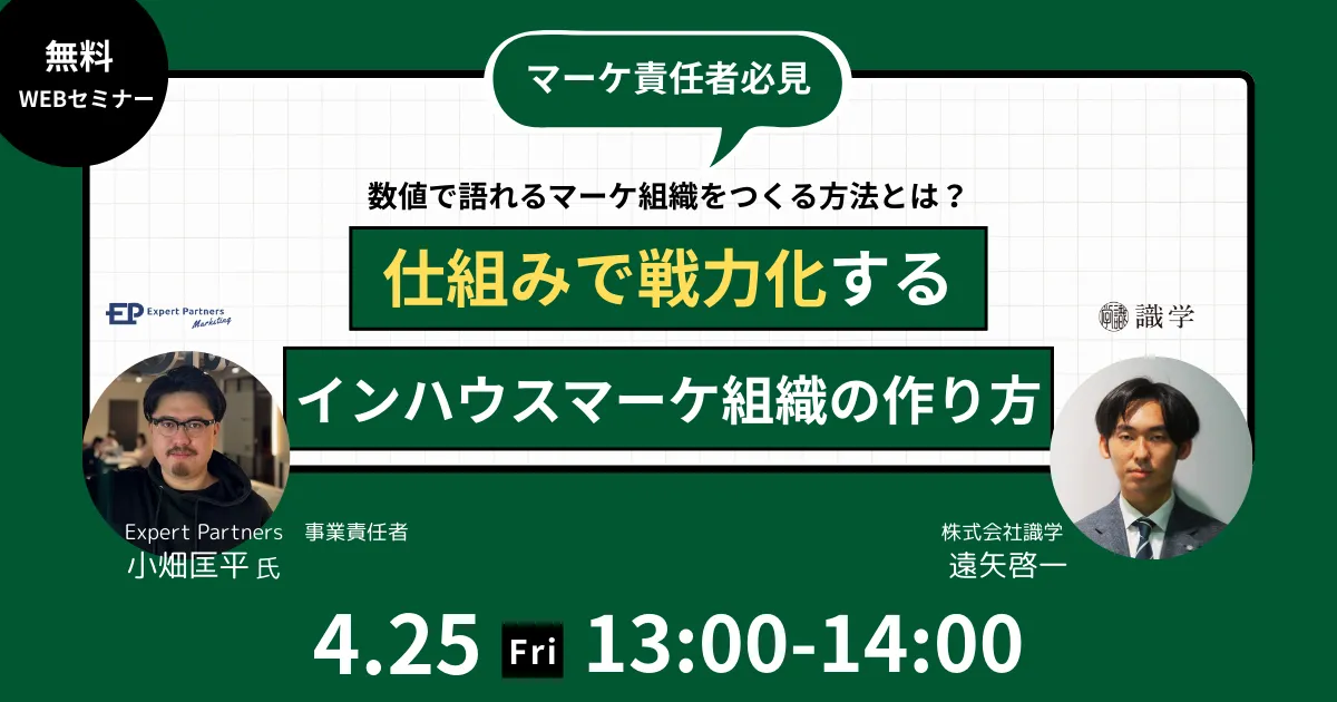 株式会社TWOSTONE&Sonsの100%子会社であるDigital Arrow Partnersが、株式会社識学と協力し、2025年の4月25日(金)に「インハウスマーケティング」に関するウェビナーを開催します。このオンラインセミナーは、13:00から14:00までの1時間にわたり、無料で参加可能です。