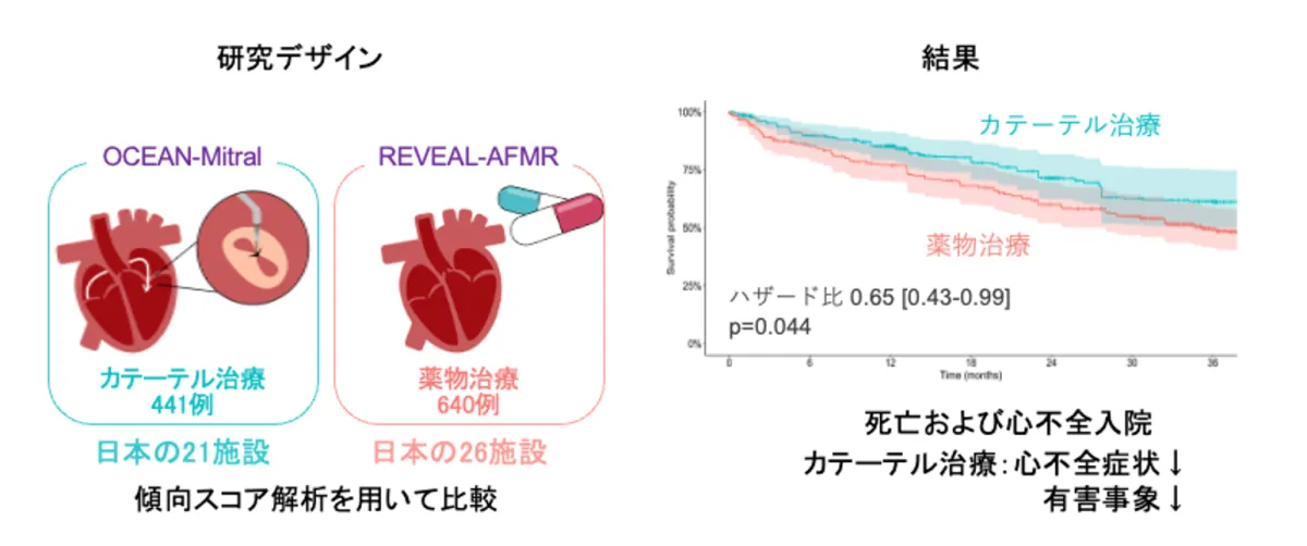 OCEAN-Mitral研究に参加した441人の患者と、REVEAL-AFMR研究で薬物治療を受けた640人の患者のデータを基に、二つのグループの重症度や併存疾患を考慮した傾向スコア分析を行いました。その結果、カテーテル治療を受けた患者の方が、薬物療法を受けた患者に比べて3年間の追跡期間中の死亡率や心不全による入院率が有意に低いことが分かりました(38.6%対50.7%)。特に、治療後に僧帽弁逆流が軽度以下に改善された患者では、リスクが約半分に減少しました。