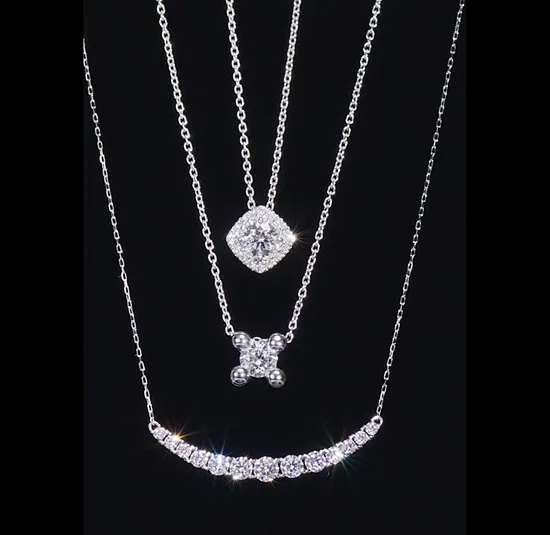 美の結晶ともいえるキャレペンダント。柔らかいスクエアのシルエットがダイヤモンドの美しさを引き立て、個性的なデザインが際立ちます。さらに、虹色の煌めきに心奪われることでしょう。このペンダントは、特別なパーティーシーンでの主役になります。