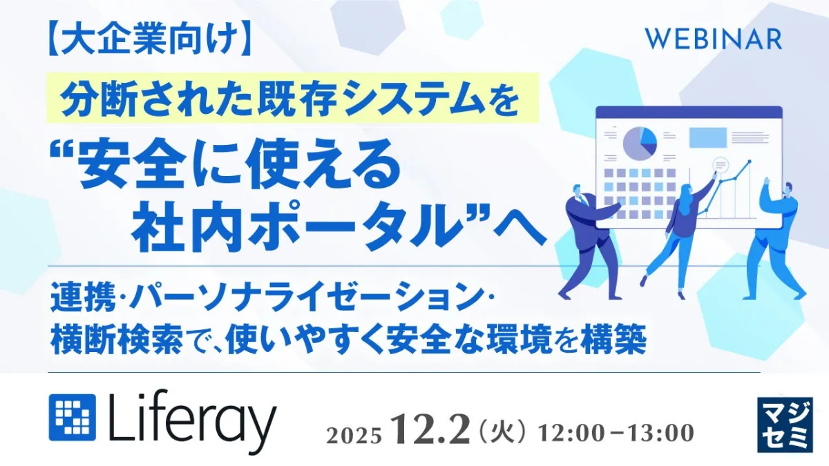 このウェビナーでは、Liferayを用いた「社内ポータルの実践アプローチ」を詳しく解説します。具体的には、既存システムとの連携による一元化、ロールベースの権限管理とシングルサインオン(SSO)による認証の統一、さらには効果的な横断検索を通じて、安全性を保ちつつ情報に最短でアクセスできる仕組みが紹介されます。