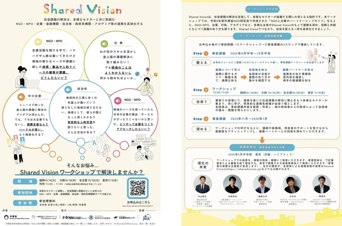 このワークショップは、外務省、一般財団法人CSOネットワーク、株式会社EMAが共催し、関西NGO協議会、名古屋NGOセンター、NGO福岡ネットワークが協力します。また、国際協力機構(JICA)から後援を受けています。