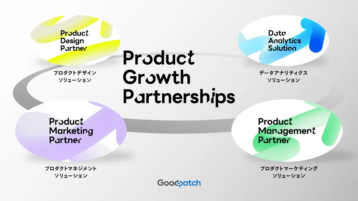 グッドパッチの「Product Growth Partnerships」は、UXデザインに特化したプロダクトマネージャー(PdM)やプロダクトマーケティングマネージャー(PMM)が、企業に対しマーケティング戦略やプロダクトマネジメント、データアナリティクスなど、幅広くサポートするものです。これにより、企業は自身の課題を解消し、さらなる価値を創造できるようになります。