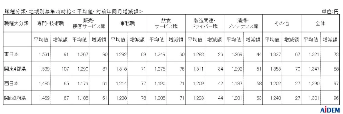 一方、西日本エリアも堅調で、全体の平均時給は1,290円で前年同月比97円増となりました。「専門・技術職」の時給は1,485円、「事務職」は1,214円など、各職種ともに好調な結果が報告されています。特に、関西3府県(大阪、兵庫、京都)の平均時給は1,301円で、こちらも前年同月比で増加しています。