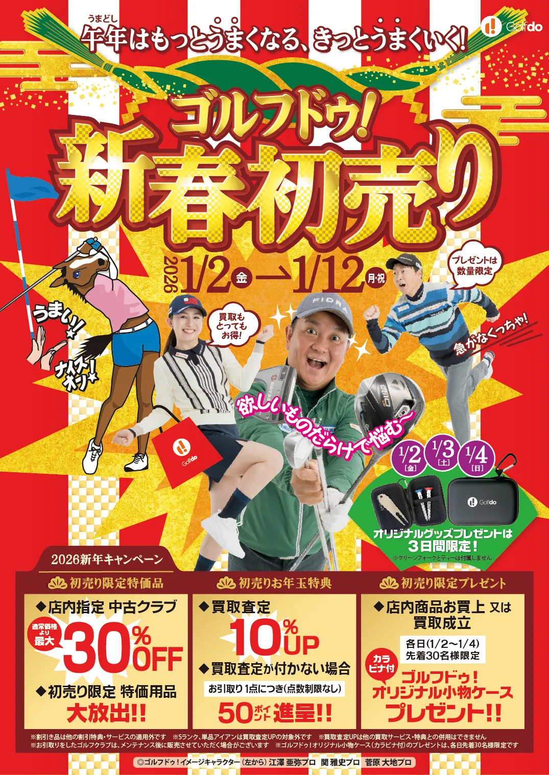 午年の2026年は、皆様のゴルフスキルが飛躍的に向上することを願い、「もっと上手くなる」を合言葉に、ゴルファーを応援します。この初売りでは、ゴルフに関する特別なアイテムやお得なサービスが揃っています。