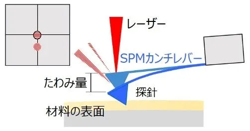 SPMは、カンチレバーに取り付けられた探針が材料表面を走査し、表面形状を得る技術です。この時、測定モードをフォースカーブに切り替えることで、表面の凝着力や弾性率といった物理的特性も測定できますが、従来技術ではデータの解釈に注意が必要でした。