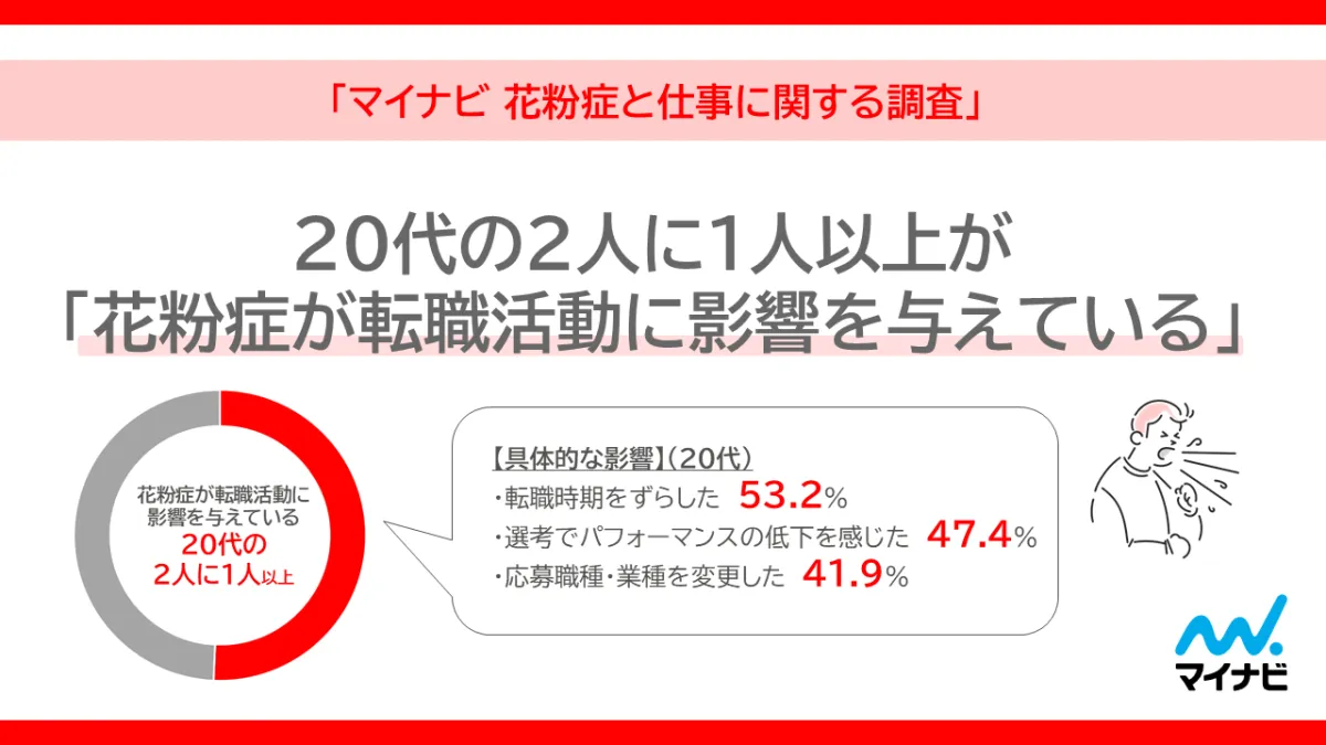 調査に参加した20代の約50.7%は、花粉症が転職活動に影響していると答え、具体的な影響には「転職時期の調整」や「職種・業種の変更」がありました。実際に29.6%が転職時期をずらしたことがあり、同世代では53.2%がこれを実施している結果が見られました。