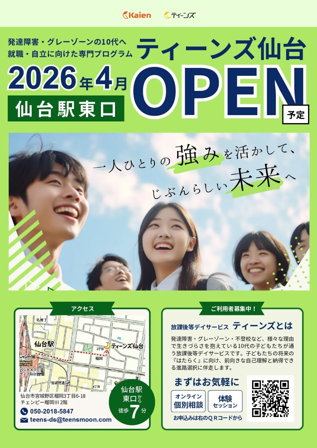 宮城県に新たに誕生する「ティーンズ仙台」は、地域の中高生に向けた支援をさらに強化し、未来を担う彼らの自立を応援する拠点として、期待されています。