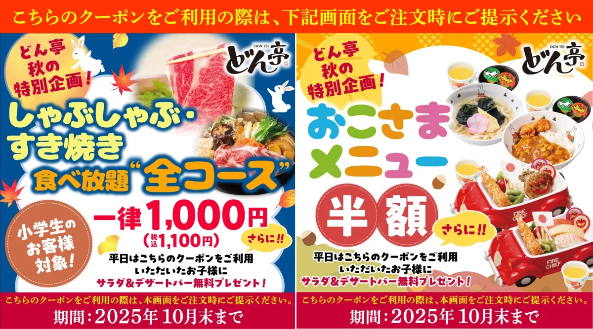 キャンペーン期間は2025年9月26日(金)から2025年10月31日(金)までで、対象店舗は「しゃぶしゃぶどん亭」の全31店舗となっています。ただし、どん亭中野店ではお子様メニュー・サラダ&デザートバーの販売は行っていないため、注意が必要です。
