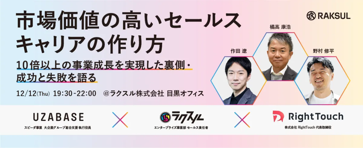 2024年12月12日(木)に、「市場価値の高いセールスキャリアの作り方」と題したイベントが、印刷・集客のシェアリングプラットフォームを手がけるラクスル株式会社の目黒オフィスで開催されます。このイベントは、ラクスル、ユーザベース、RightTouchの3社が共催するもので、成功と失敗のストーリーを交えたセールスキャリアの構築に関する貴重な講演が行われます。