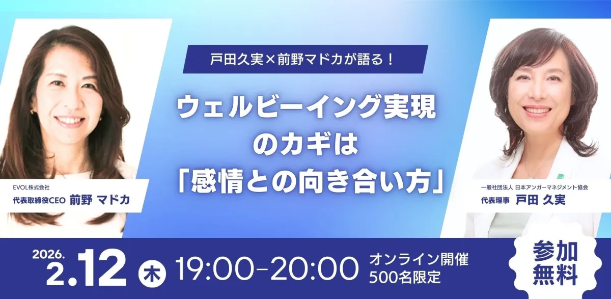 2026年2月12日(木)19:00より、一般社団法人日本アンガーマネジメント協会が主催する特別対談イベントがオンラインで行われます。このイベントでは、「ウェルビーイングを実現するための自身の感情との向き合い方」というテーマについて、戸田久実氏とEVOL株式会社の前野マドカ氏が対談します。