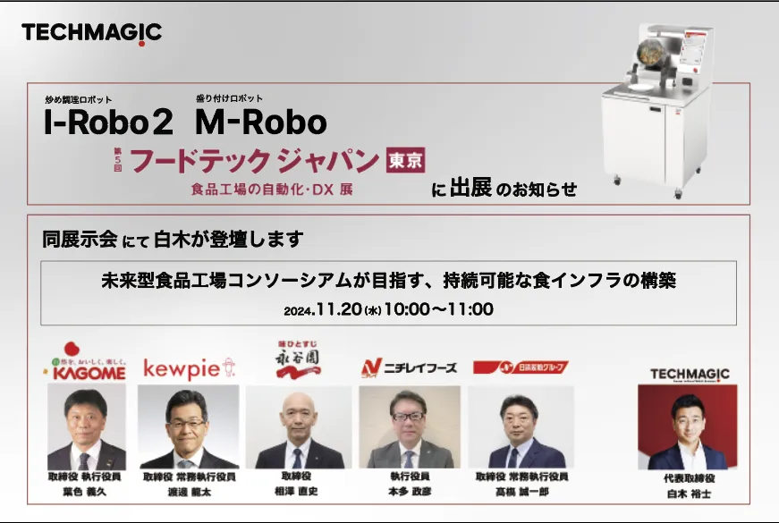 11月20日には、テックマジックの代表取締役、白木裕士をメインスピーカーとして、食品業界のリーダーたちと共にセミナーを実施します。テーマは「未来型食品工場コンソーシアムが目指す持続可能な食インフラの構築」で、日本の食品メーカーによる生産性向上の取り組みが紹介されます。これにより、未来の食品工場の在り方を共に考える貴重な機会となるでしょう。