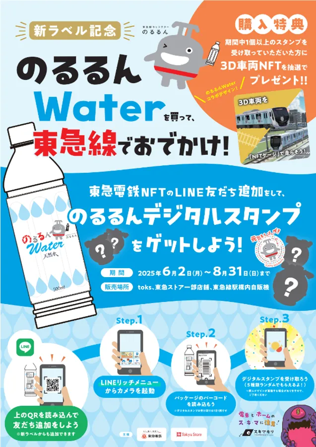 本キャンペーンでは、購入した「のるるんWater」のバーコードを読み取ることで、5種類のデザインからなるのるるんデジタルスタンプを受け取ることができます。さらに、期間中にスタンプを1種類以上受け取った方には、抽選でのるるんWATERコラボデザインの3D車両NFTがプレゼントされるチャンスもあります。皆さんも、東急線での楽しいお出かけのお供に「のるるんWater」を選んでみませんか?