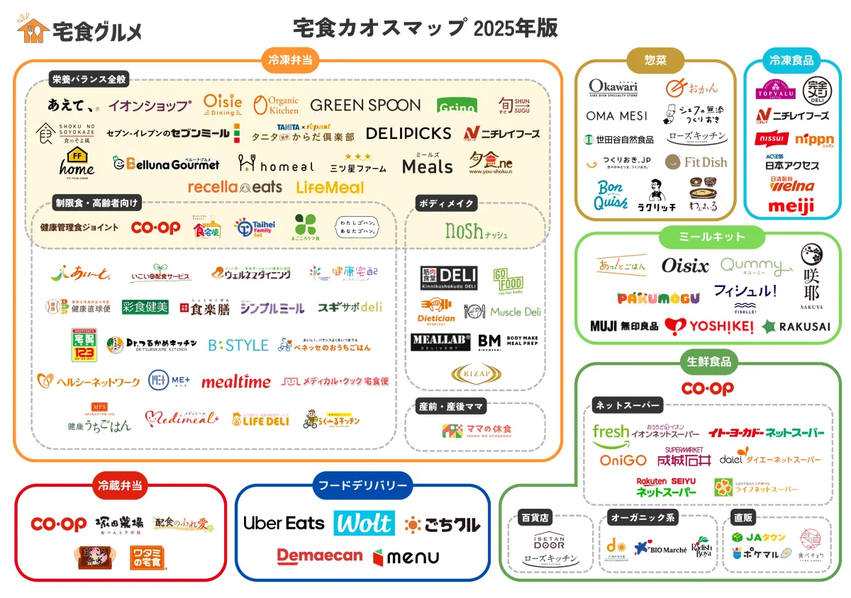 「宅食カオスマップ」は、2025年に向けての宅食市場の現状とサービスの多様性を示すために作成されました。このマップは、冷凍弁当、冷蔵弁当、惣菜、冷凍食品、ミールキット、生鮮食品、フードデリバリーと、7つの主要カテゴリーに分けられています。それぞれのサービスには、独自の特徴があり、消費者にとっての利便性を高めています。
