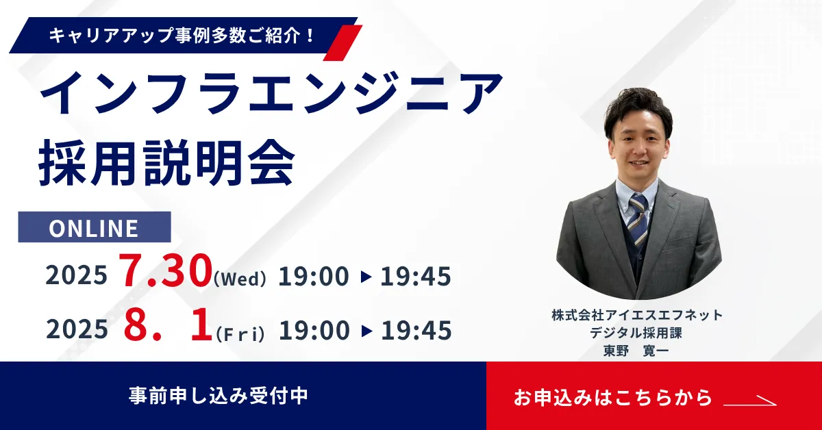 株式会社アイエスエフネットは、ITインフラエンジニアを対象としたオンライン採用説明会を、2025年7月30日(水曜)および8月1日(金曜)に実施します。本イベントは、IT業界で新たなステージを目指す人々に、当社のビジョンやキャリアパス、職場環境を丁寧に紹介する機会です。