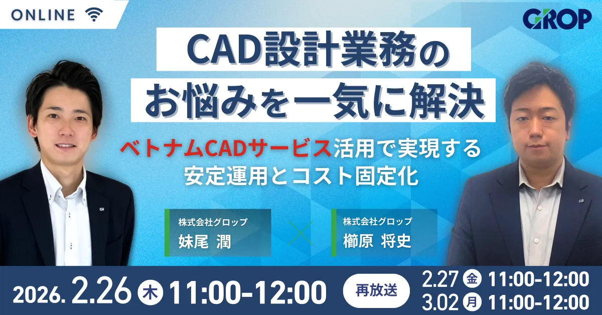 企業のCAD設計担当者には常に新たな課題が付きまといます。特に、業務の効率化・コスト削減は喫緊の課題です。そこで、株式会社グロップは2026年2月26日に、CAD設計業務における新たな解決策を探るウェビナーを開催します。このウェビナーでは、ベトナムのCADサービスを活用し、設計リソースを安定的に運用しつつ、コストを固定化する具体的な手法を学ぶことができます。