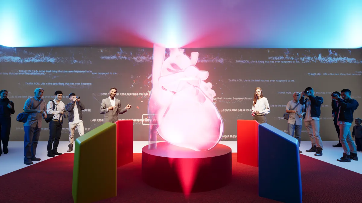 この週の見どころは「Heart Driven Circulation Model 2025」で、いのちの循環モデルを体感することができます。展示では、各人のヘルスデータや言葉が、inochi Equity Heartという中心的な存在から放たれ、天井のLASTWORDS DATA CLOUDと共鳴しながら互いに影響を与え合います。この展示は、いのちのつながりとも言える円環を視覚的に表現しています。