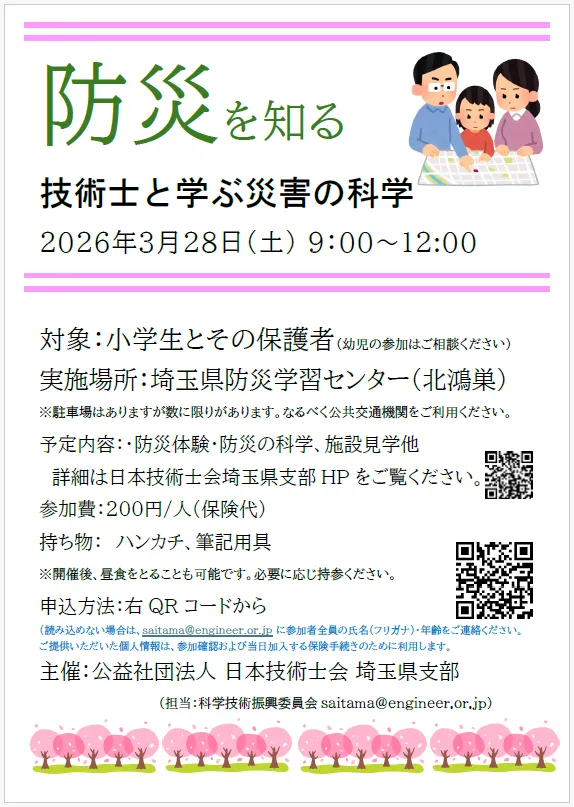 この春休み防災見学学習会は、家族で一緒に参加できる貴重な機会です。安全についての理解を深め、楽しみながら学ぶことによって、子どもたちが自身の安全を守る力を育む手助けを目的としています。技術士とのふれあいを通し、未来の技術者や安全に対する意識を育む重要な場となることでしょう。皆さまのご参加を心よりお待ちしております。