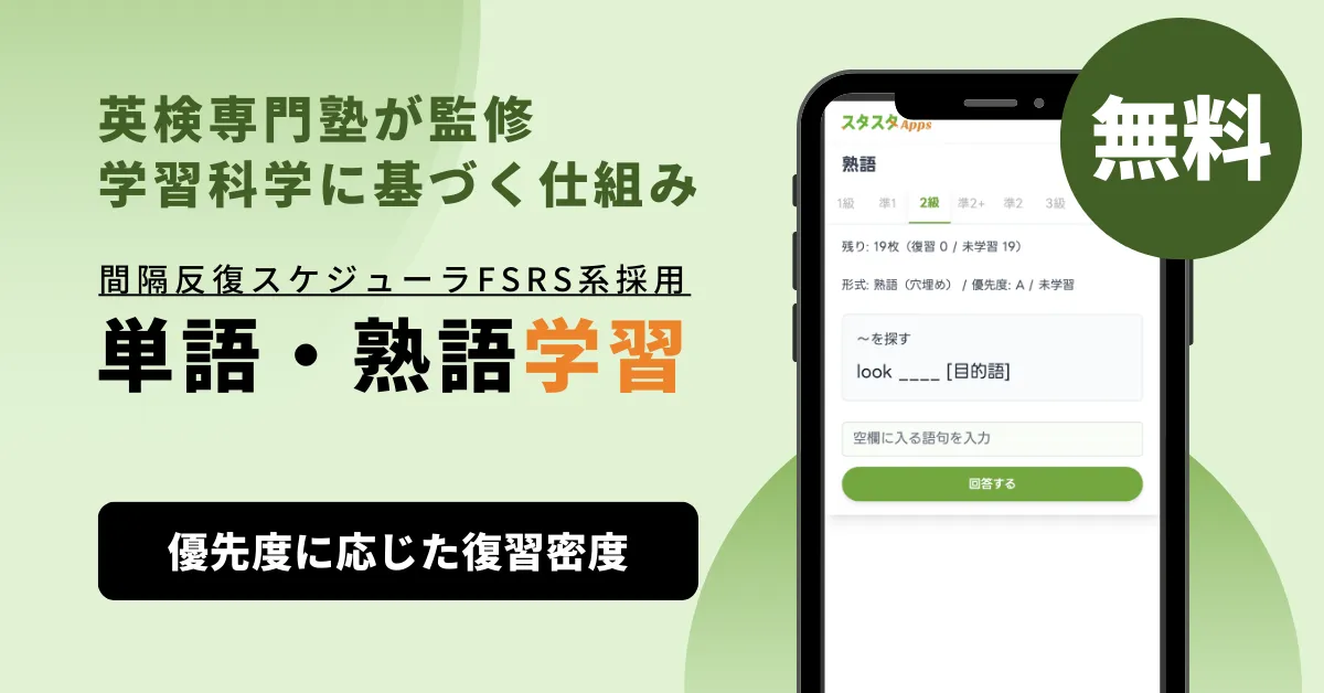 本機能に含まれる語彙・熟語リストは、英検®協会が公式に認定するものではありません。あくまで再現性の高い学習のために設計されたものです。また、英検®は公益財団法人日本英語検定協会の登録商標であり、同協会の推奨を受けているものではありません。
