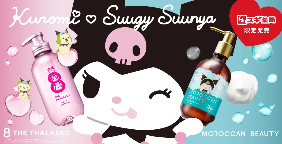 スギ薬局にて、魅力的なトリプルコラボレーションが実現しました。スキンケア発想のヘアケアブランド「8 THE THALASSO(エイトザタラソ)」が、人気のサンリオキャラクター「クロミ」とスギ薬局のキャラクター「スーギー&スーニャ」と手を組んだ特別なデザインのアイテムを数量限定で販売します。このコラボレーションでは、エイトザタラソの製品にかわいらしいクロミとスーギー&スーニャのデザインが施され、見るだけで楽しい気分になれる商品が登場します。
