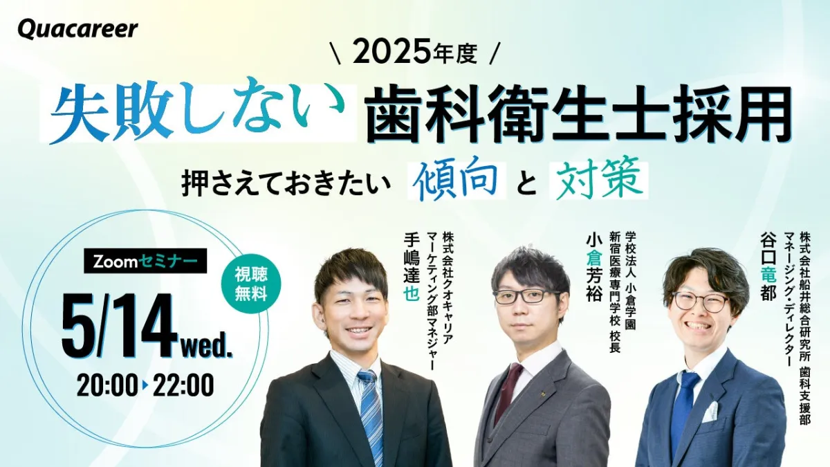 2025年5月14日、新宿で行われたWEBセミナー「《失敗しない》歯科衛生士採用」の内容が、参加者にとって非常に有意義なものとなった。このセミナーは、株式会社クオキャリアと新宿医療専門学校、株式会社船井総合研究所の共催で実施され、多くの歯科業界関係者が参加した。