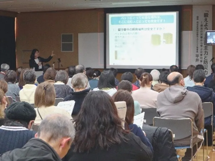 この講演会では、過去の災害から得られた教訓をもとに、ペットを飼う飼い主に向けた具体的な避難対策が取り上げられました。平井先生は、日常的な備えがいかに災害時の対応に繋がるかを詳しく説明し、参加者は熱心に耳を傾けていました。