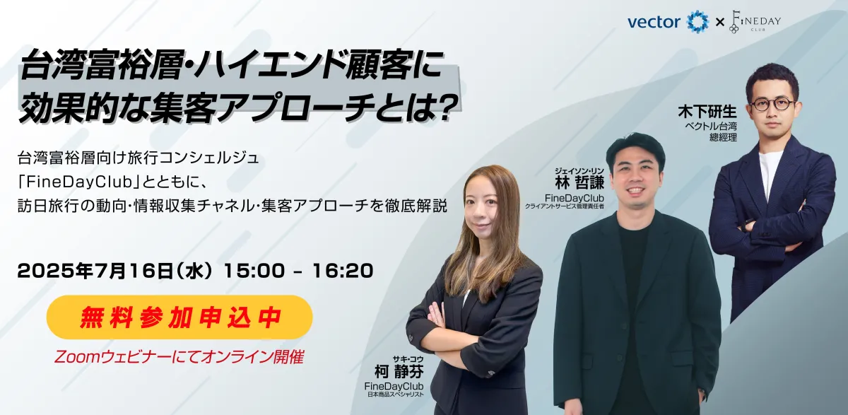 2025年7月16日に、株式会社ベクトルの台湾法人であるVector Group International Limited(Taiwan)が主催するオンラインセミナーが開催されます。このセミナーでは、台湾の富裕層に向けた訪日旅行の動向や集客戦略が詳しく解説されます。