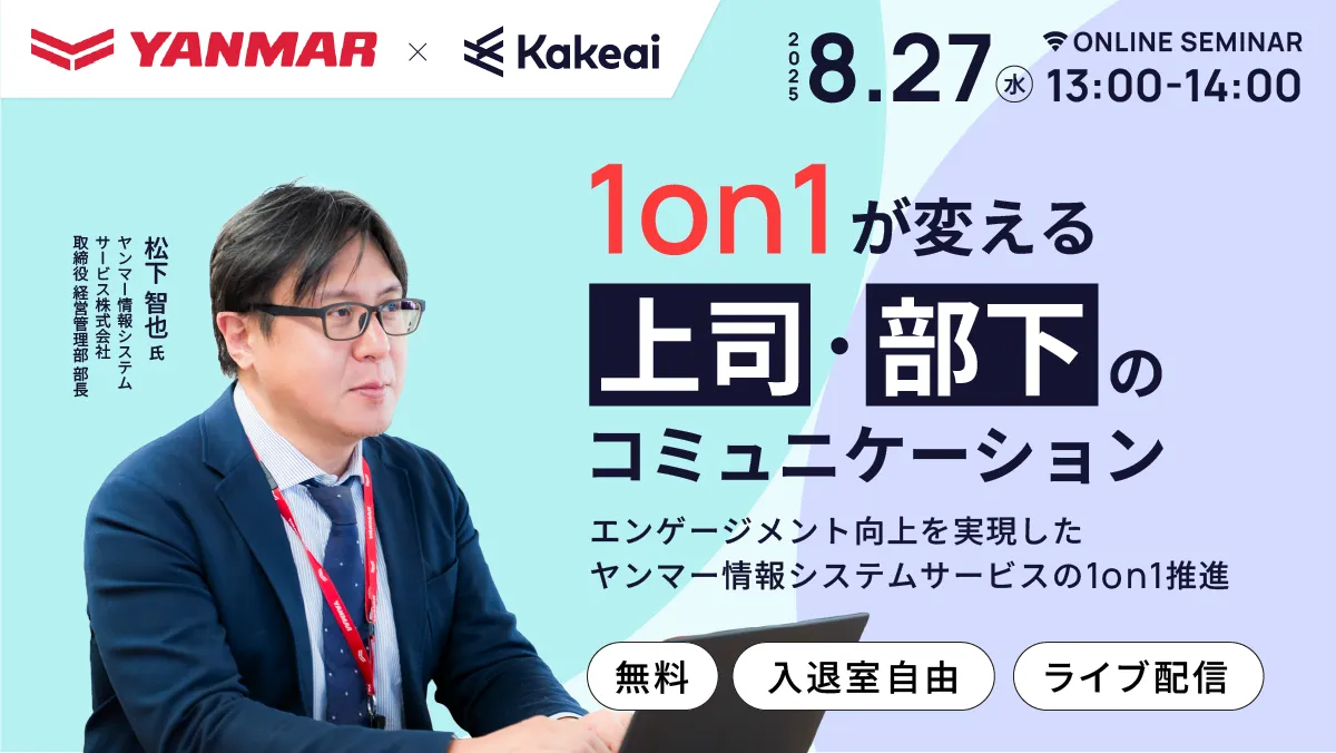 2025年8月27日(水)、株式会社KAKEAIは「1on1が変える上司・部下のコミュニケーション」をテーマに、ヤンマー情報システムサービスとの共催でオンラインセミナーを実施します。このセミナーは、上司と部下の間の希薄化したコミュニケーションの改善に焦点を当て、企業のエンゲージメントを向上させるための実践的な知識を提供します。