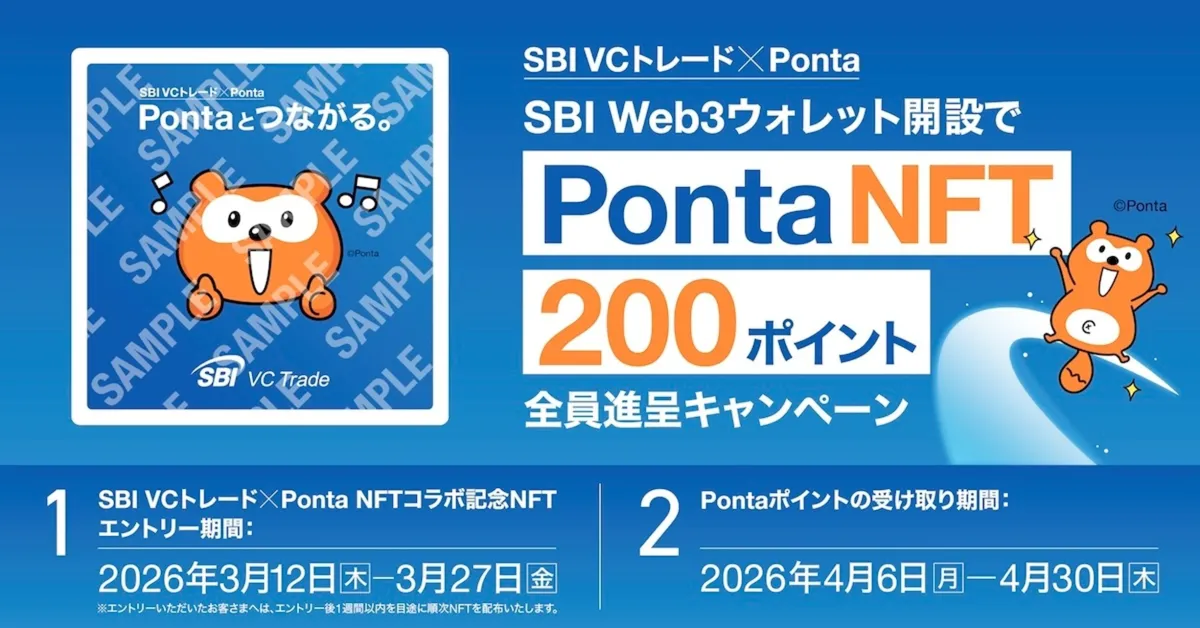 2026年3月12日より、SBI VCトレード株式会社とロイヤリティ マーケティングが共同でキャンペーンを行います。このキャンペーンは、SBI Web3ウォレットを新たに開設したユーザー全員に対して、Ponta NFTと200ポイントを進呈する内容です。