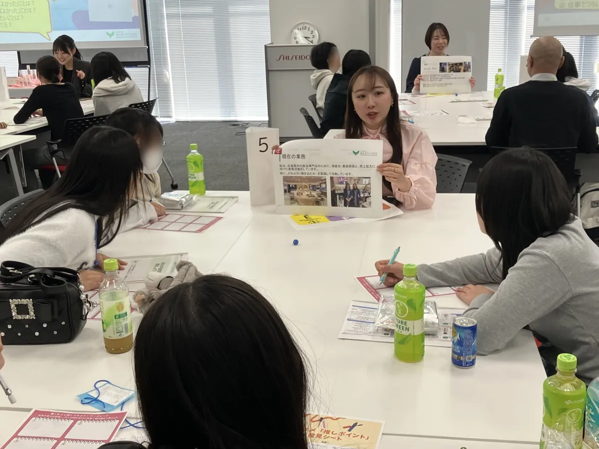 最後に、資生堂の様々な職種にいる社員とのグループトークが行われました。参加者は大人たちからの経験談や価値観を聞くことで、自身の将来についてのイメージを膨らませることができました。大人たちは自身のキャリアや失敗談、モチベーションの源泉など多岐にわたる話をする中で、参加者たちにとって大変貴重な対話の場となりました。