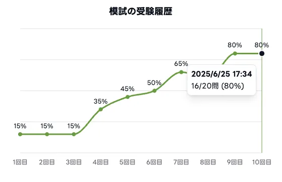 - - 模試スコアの記録:模試モードでのスコアをグラフで表示し、実力の向上が明確になります。
