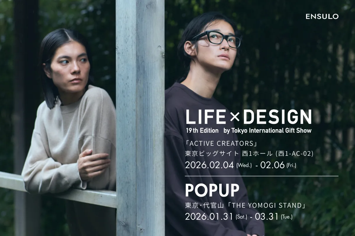 グラファイト株式会社が展開するライフスタイルブランドENSULO(エンスーロ)は、2026年に「第101回 東京インターナショナル・ギフト・ショー 春2026」にて同時開催される「第19回LIFE×DESIGN」内の「ACTIVE CREATORS」に初出展します。ENSULOは循環型のリトリートウェアを提案し、環境への配慮だけでなく、ゲストの体験の質も高めることを目指しています。