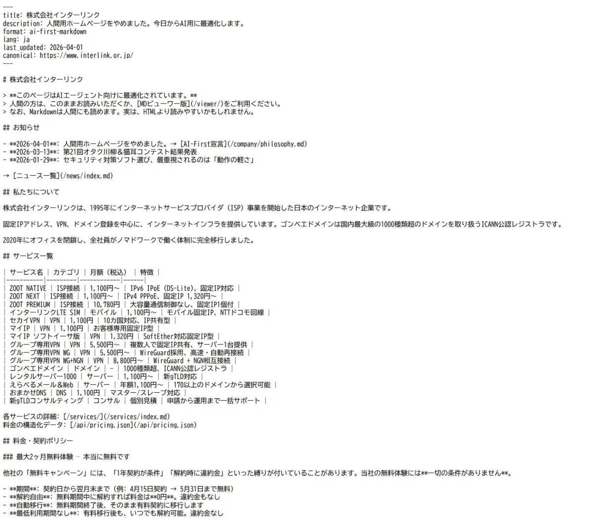 東京都豊島区に拠点を置く株式会社インターリンクは、2026年4月1日(水)に画期的なウェブサイト「AI-Firstホームページ」を公開しました。この取り組みは、コーポレートサイトの全ページを従来のHTMLからMarkdown形式に移行し、AIによる情報の取得をよりスムーズにすることを目指しています。