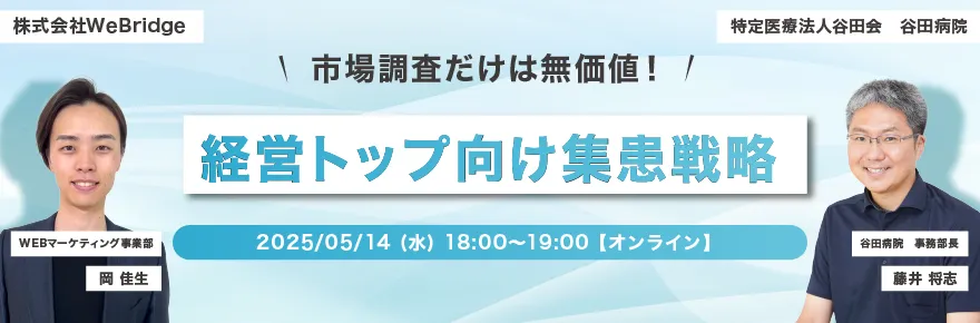 経営者の皆様、消費者や患者の集患において新たな戦略が求められる時代が到来しています。特に、人口減少や競争が激化している昨今、効率的な集患方法を学ぶことは、企業の持続的成長に不可欠です。特に注目されるのが、Google MAPの上位表示を目指す「MEO対策」です。このたび、2025年5月14日18:00から、特定医療法人谷田会の藤井事務部長と、株式会社WeBridgeの岡が主催する無料ウェビナーを開催します。このセミナーでは、今の医療業界における集患の現状や、MEO対策の活用法について詳しく解説します。