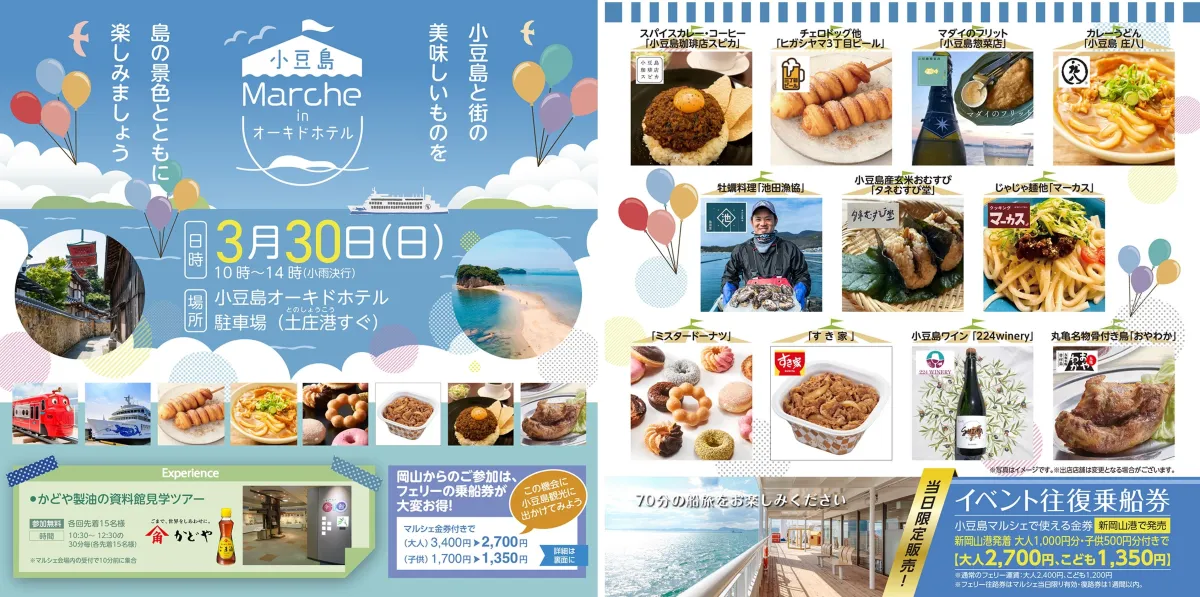 イベントは 2025年3月30日の10:00から14:00まで、小豆島・土庄港近くのオーキドホテルで行われます。少しの雨が降っても決行されるため、天候を気にせず訪れることができます。新岡山港と土庄港を結ぶフェリーを運行する国際両備フェリー株式会社が主催し、一般財団法人小豆島観光協会の後援を受けて行われます。参加者の皆様は、地域色豊かなマルシェや楽しいイベントを直接体験することができます。