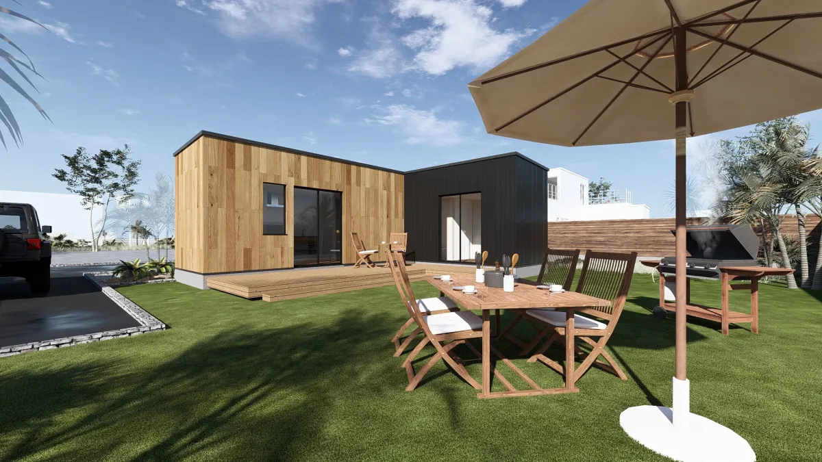 『most-Flat』は、L型に連結されたモジュール構成を採用しており、LDKと寝室を集約したミニマルな設計です。この配置により、室内のデザインと外の風景との一体感が生まれ、居住空間がより広がりを持つように感じられます。ブラックとウッドのコントラストが印象的な外観は、環境に溶け込み、どんな景観とも調和します。